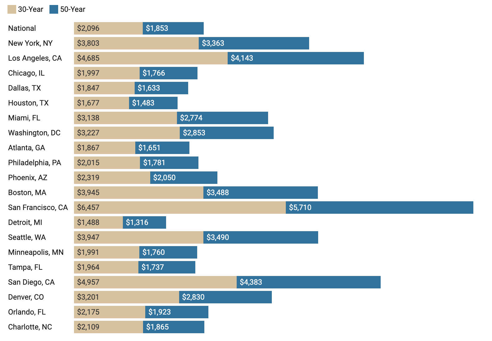 The annual savings are even more lucrative in California. If you bought a home for the San Franciscan median price of $1,315,000, your monthly payment with a 50-year mortgage would save you $8,967 a year over a 30-year mortgage. Similarly, in San Diego, you stand to save nearly $7,000 a year.