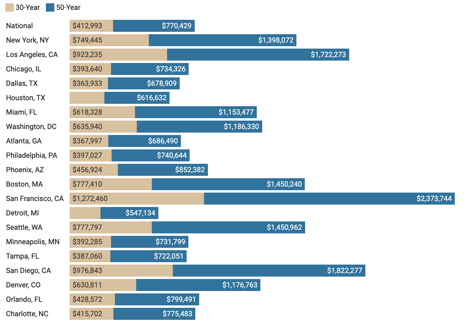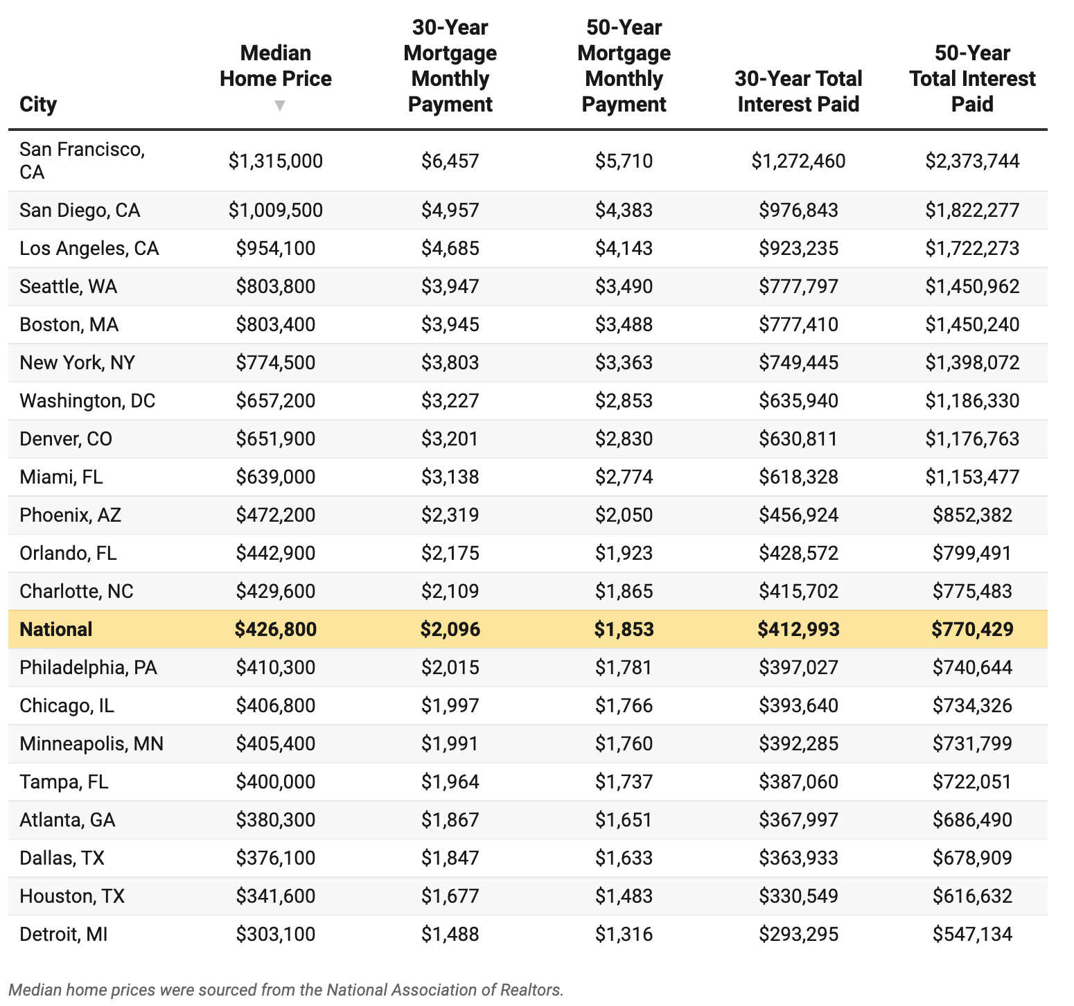 Even in more affordable cities, the difference in interest paid on a 30-year mortgage and a 50-year mortgage is substantial. Take Detroit, for example, which has a median home price of $303,100. With a 30-year mortgage, a Detroit homeowner would pay $293,295 in interest, while a homeowner with a 50-year mortgage would pay $547,134. Opting for a 30-year mortgage would save that Detroit homeowner $250,000 in interest.